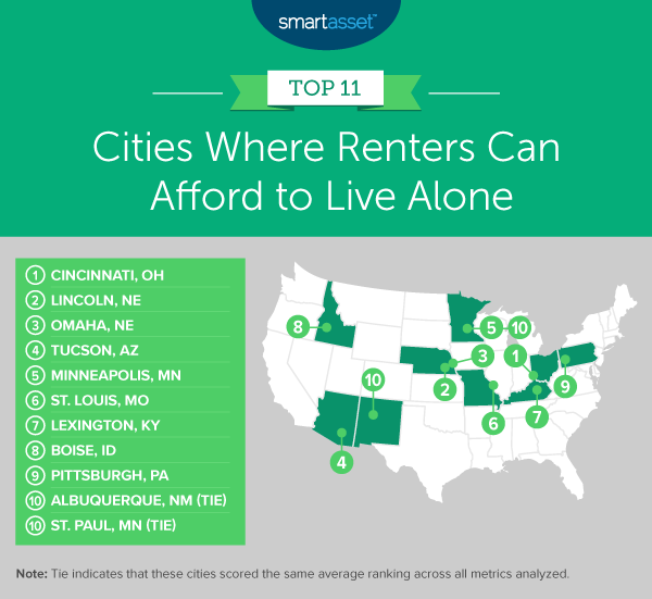 - Cincinnati, Ohio takes the top spot for the third year in a row. Cincinnati, Ohio has ranked as the best city where renters can afford to live alone for all three years SmartAsset has produced this study. Though the average monthly rent for a unit with fewer than two bedrooms increased slightly (about $50) between last year and this year, the city still ranks within the best fifth of cities for that metric and two others – percentage of housing units with fewer than two bedrooms (29.60%) and cost of living ($19,713).