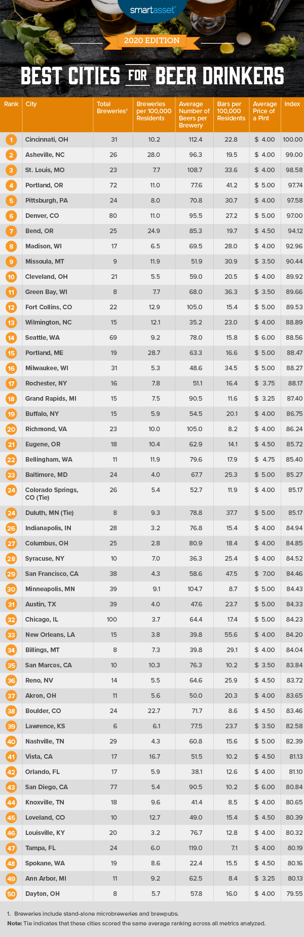 For the second consecutive year, Cincinnati, Ohio is the best city in America for beer drinkers. There are 31 breweries in the Queen City, the 10th-highest number for this metric in the study. That comes to 10.20 breweries per 100,000 residents, ranking 22nd out of 384 cities. Cincinnati breweries offer, on average, around 112 different beers, ranking 18th out of 384 cities.