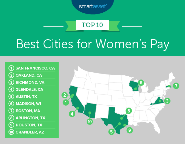 SmartAsset analyzed data across 150 cities to find the best cities in the country for women’s pay. Specifically, we considered median earnings for women, growth in women’s earnings, women’s earnings as a percentage of men’s and the change in women’s earnings as a percentage of men’s. For details on data sources and how we put all the information together to create our final rankings, see the Data and Methodology section below.