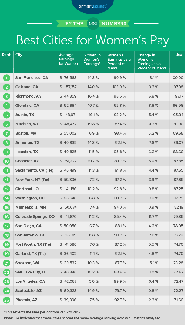 • Pay equity still needs more progress. While many cities have seen the women’s earnings as a percentage of men’s earnings go up, more than half of the cities in our study have seen it go down. According to our data, 89 of the 150 cities we considered saw women’s earnings decrease as a percentage of men’s. There are only two cities in our entire study – Oakland, California and Dallas, Texas – where women’s earnings are at least equal to men’s. Dallas, though, does not crack the top 10 in our overall study on the best cities for women’s pay, because average women’s earnings and growth in women’s earnings there are not as high as in the top cities on our list.