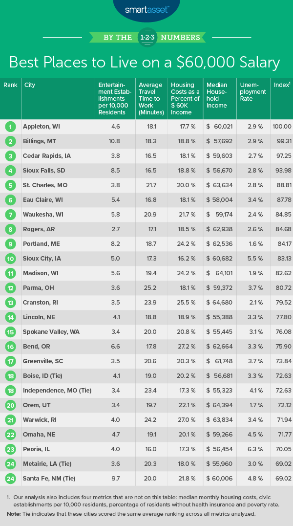 To find the best places in the U.S. to live on a $60,000 salary, we analyzed data for 109 cities across nine metrics: median household income, median monthly housing costs, housing costs as a percentage of income, entertainment and civic establishments per 10,000 residents, percentage of people without health insurance, average commute time, unemployment rate and the poverty rate. For details on our data sources and how we put all the information together to create our final rankings, check out the Data and Methodology section below.