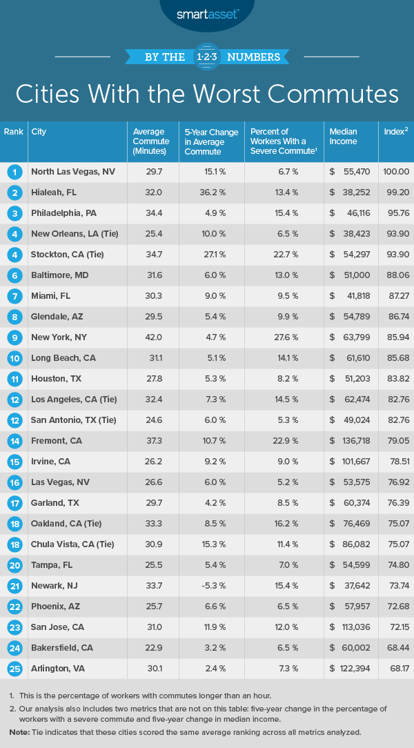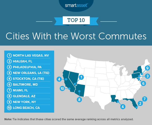 - Commutes longer than one hour dominate the top of the list. Eight out of the 10 cities in the study with the worst commutes – all except North Las Vegas, Nevada and New Orleans, Louisiana – rank in the worst 25% of the study for their high percentages of residents traveling over an hour to get to work.