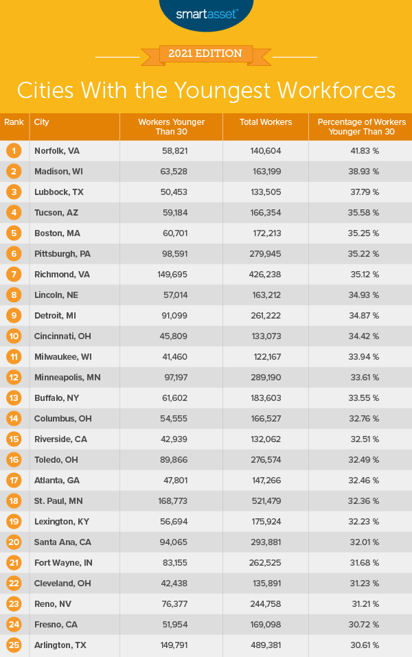 This is SmartAsset’s second annual study on the cities with the youngest workforces. You can read our 2020 edition here.