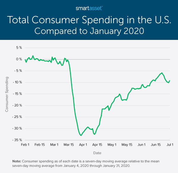 One way to visualize the recession’s shape thus far is to examine consumer spending. Consumer spending accounts for roughly 68% of U.S. GDP, and thus drastically impacts the length and severity of a recession. In this study, SmartAsset took a closer look at consumer spending in the U.S. during COVID-19.