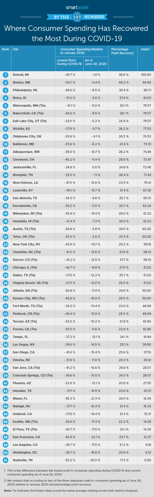 SmartAsset analyzed data for 51 of the largest U.S. cities to identify where consumer spending has recovered the most. Specifically, we ranked cities according to two metrics: consumer spending as of June 30, 2020 relative to average spending in January 2020, as well as percentage point recovery (i.e. the difference between the lowest point in consumer spending during COVID-19 and consumer spending as of June 30, 2020).