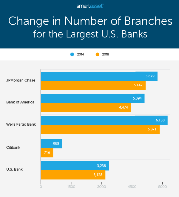The decline of branch offices has not been felt evenly by different banks and throughout the country. In this study, SmartAsset looked at trends in branch closures for the five largest banks in America and the cities where it has become most difficult to visit a physical bank. For details on our data sources and how we put all the information together to create the final rankings, check out the Data and Methodology section below.