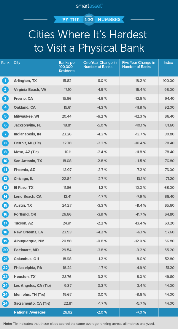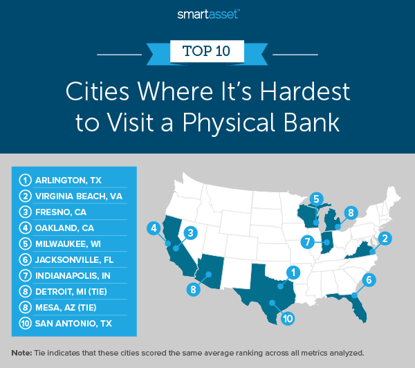 To find the cities where it’s hardest to visit a physical bank, SmartAsset looked at the 50 largest cities in the U.S., considering only federally insured banks as reported by the Federal Deposit Insurance Corporation (FDIC). We compared them across the following three metrics: