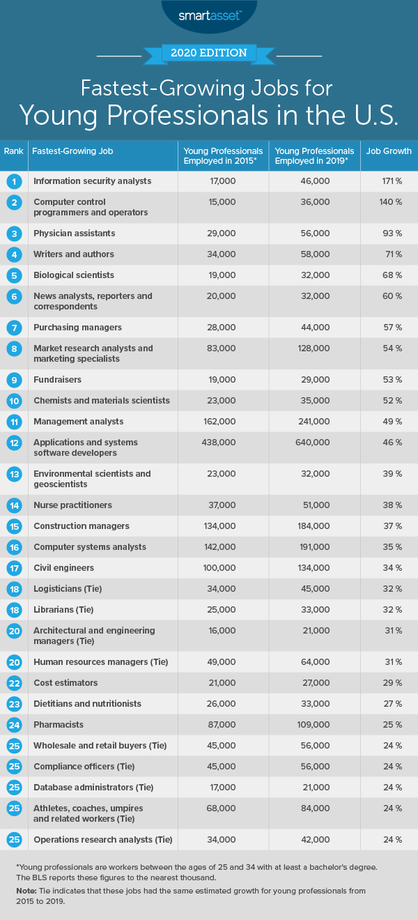 This is SmartAsset’s 2020 study on the fastest-growing jobs for young professionals. Read the 2019 version here.
