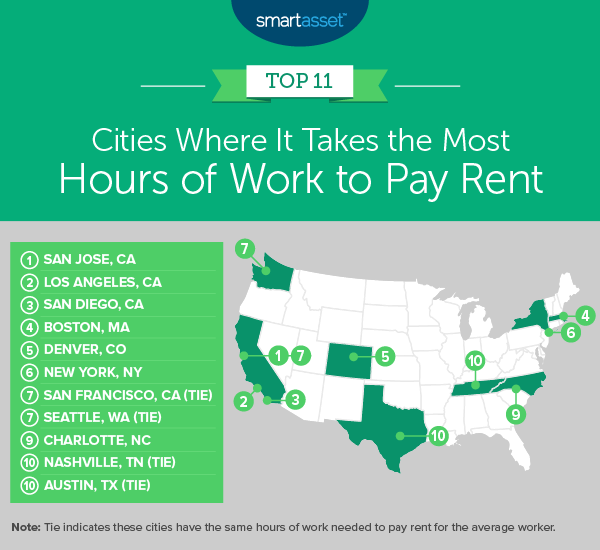 - Several cities in Western states require more work to cover rent. Of the 10 cities in the country where the highest number of hours is needed to pay rent, six are in Western states: California, Colorado and Washington State. Four of those six are in California, with an average monthly rent across them of $1,803.