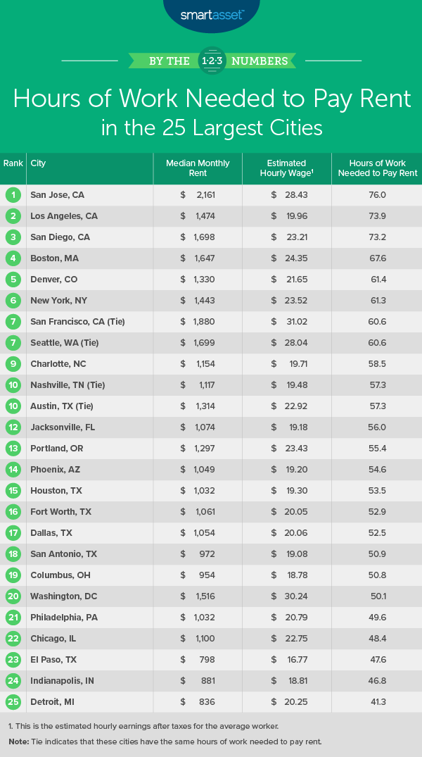 In this study, SmartAsset uncovered the hours of work needed to pay monthly rent in the 25 largest American cities, considering data on the following metrics: average annual take-home pay, average hours worked per year and median rent. For details on our data sources and how we put all the information together to create our final rankings, check out the Data and Methodology section below.