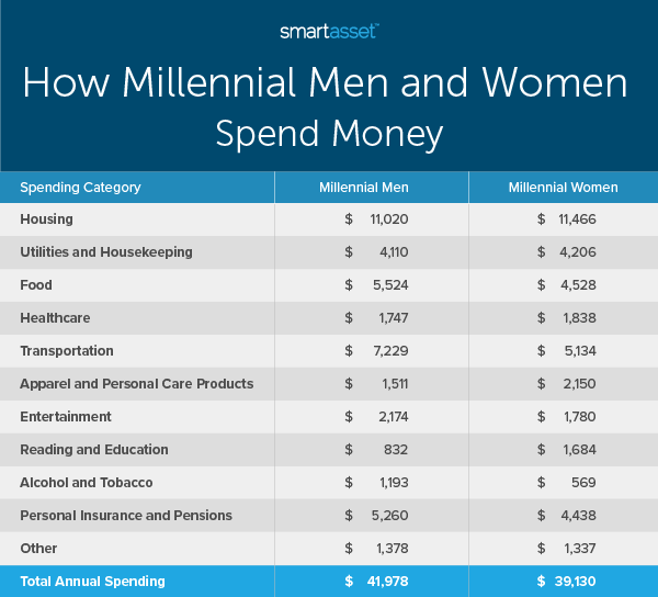 Since household formation often alters spending patterns, one of the best ways to isolate differences in spending between the sexes is by comparing singles. As millennials, born between 1981 and 1996, are less likely to have formed families relative to older generations, they provide an interesting lens to understand how men and women spend and save money. Do single millennial men and women spend and save differently? SmartAsset gathered data from the Bureau of Labor Statistics’ (BLS) Consumer Expenditure Survey to take a closer look.