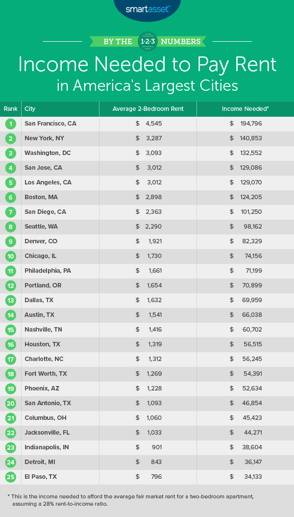 This is SmartAsset’s sixth annual study on the income need to pay rent in America’s largest cities.