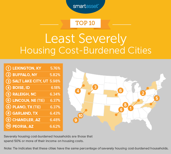 - Merrier in the middle. On the flipside, the cities with the lowest percentages of households that are severely housing cost-burdened tend to be in the middle of the country. States like Texas, Nebraska and Idaho are all represented on the lower end of our list.
