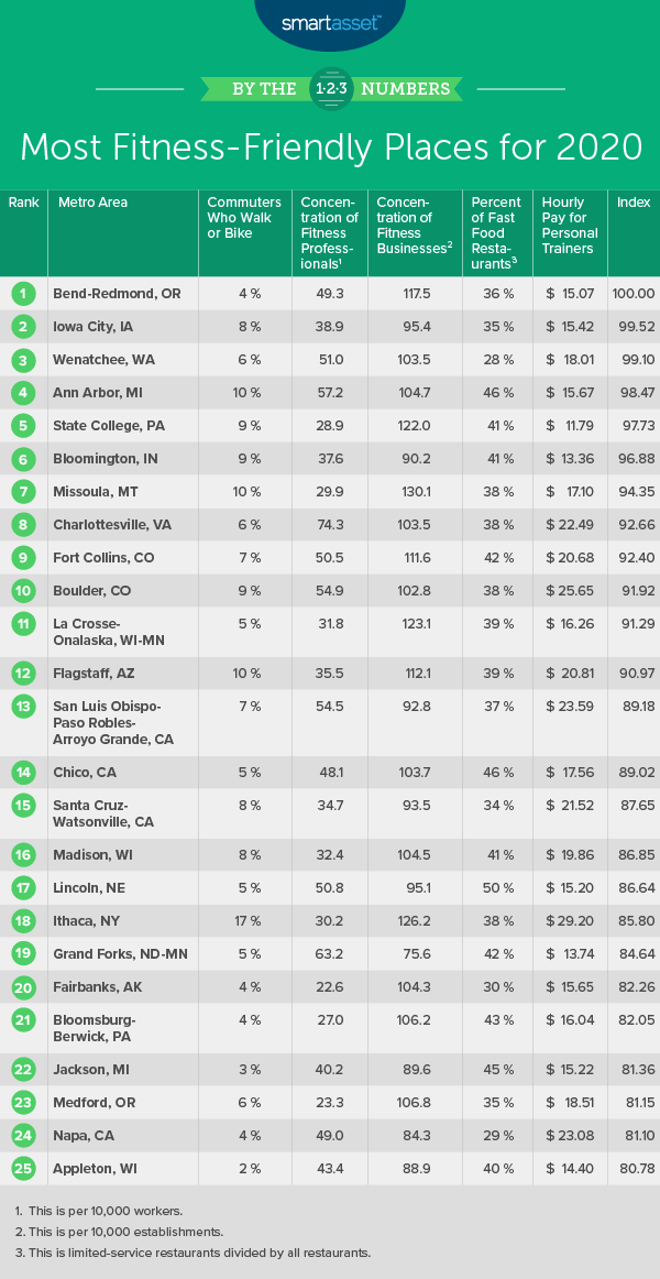 To uncover the most fitness-friendly places for 2020, we considered data on 317 metro areas across five metrics: percentage of residents who walk or bike to work, fitness professionals per 10,000 workers, fitness establishments per 10,000 establishments, percentage of restaurants that are fast food and average hourly wage of personal trainers. For details on our data sources and how we put all the information together to create our final rankings, check out the Data and Methodology section below.