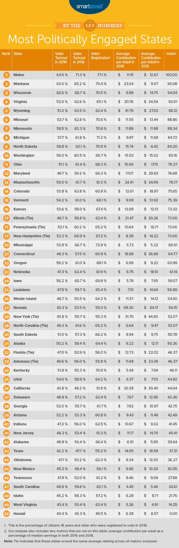 With that in mind, SmartAsset decided to crunch the numbers and find the most politically engaged states in the country. Specifically, we looked at voter turnout, registration rates and donation data. For details on our data sources and how we put all the information together to create our final rankings, check out the Data and Methodology section below.
