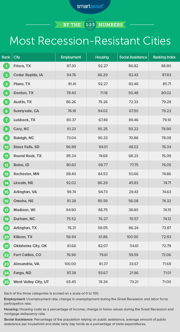 To find the most recession-resistant cities in the U.S., we examined nine metrics across three overarching categories: employment, housing and social assistance. Our employment category factors in current unemployment rate, change in unemployment rate during the Great Recession from 2007 through 2010 and the current labor force participation rate. Our housing category factors in housing costs as a percentage of income, change in home value during the Great Recession from 2007 through 2010 and mortgage delinquency rate. Our social assistance category factors in the percentage of the population relying on public assistance, average annual amount of assistance per household and state rainy-day funds as a percentage of state expenditures. For details on our data sources and how we put all the information together to create our final rankings, check out the Data and Methodology section below.