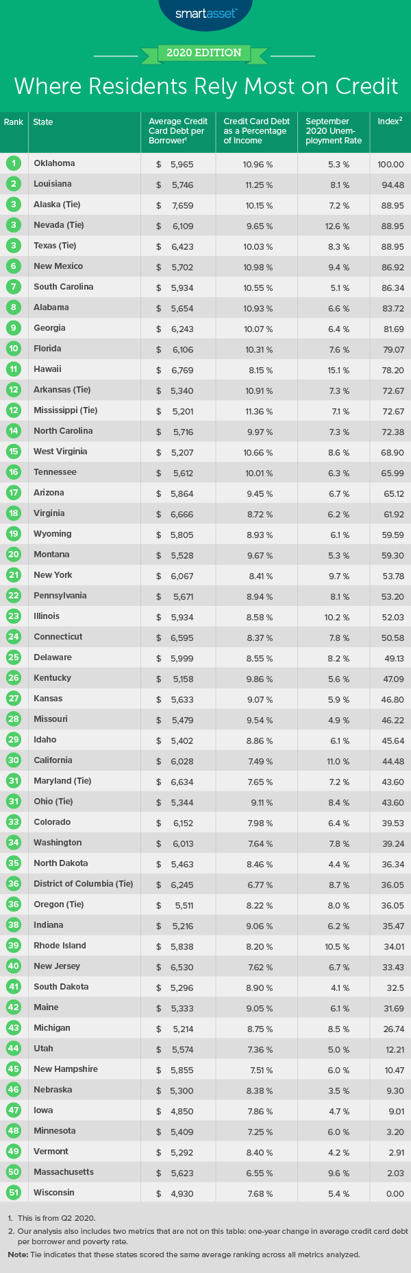 - Credit card debt is high in Southern states. Seven of the 10 states where residents rely most on credit are in the South: Oklahoma, Louisiana, Texas, South Carolina, Alabama, Georgia and Florida. In all seven states, average credit card debt exceeds $5,600 and makes up more than 10% of the median household income.