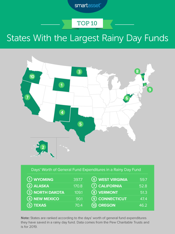 - Western states have the largest rainy day funds. Five of the 10 states with the largest 2019 rainy day funds relative to general fund expenditures are located in the West. They are Wyoming, Alaska, New Mexico, California and Oregon. In 2019, all five of these states had more than 45 days’ worth of general fund expenditures saved in a rainy day fund.