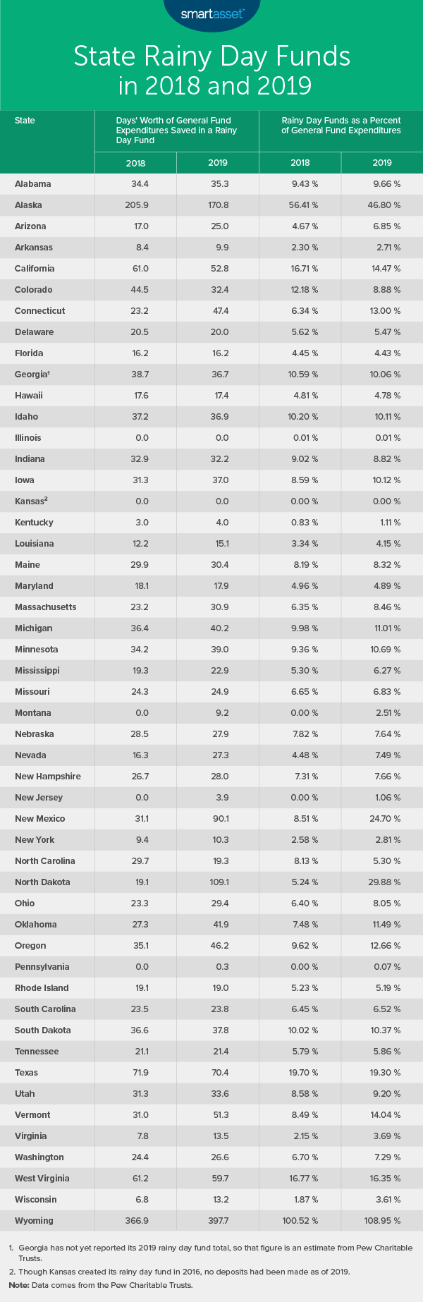 In this study, SmartAsset uncovered the states with the largest rainy day funds. Specifically, we ranked all 50 states based on the number of days’ worth of general fund expenditures saved in their rainy day funds in 2019. We also looked at rainy day funds as a percentage of each state’s general fund expenditures. For details on our data sources and how we put all the information together to create our final rankings, check out the Data and Methodology section below.
