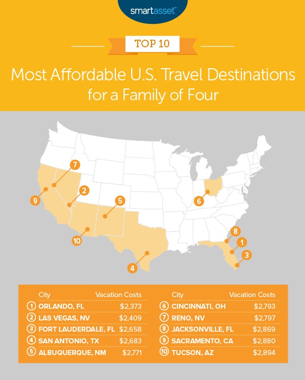 Orlando, Florida, the theme park capital of the U.S., is once again the most affordable vacation destination in America. A family of four can expect to pay approximately $2,373 for a three-day, three-night vacation, including the cost of round-trip air travel and nightly hotel rooms. An individual could take a trip to Orlando for a total of around $853.