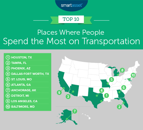The weather is nice and the beach is nearby, but residents of Tampa, Florida on the Gulf Coast are going to end up spending a lot to get around. On average, Tampa denizens spend $8,307 on transportation, which is actually the smallest amount in our top 10. But a relatively low average income means that 13.77% of it is going toward transportation.