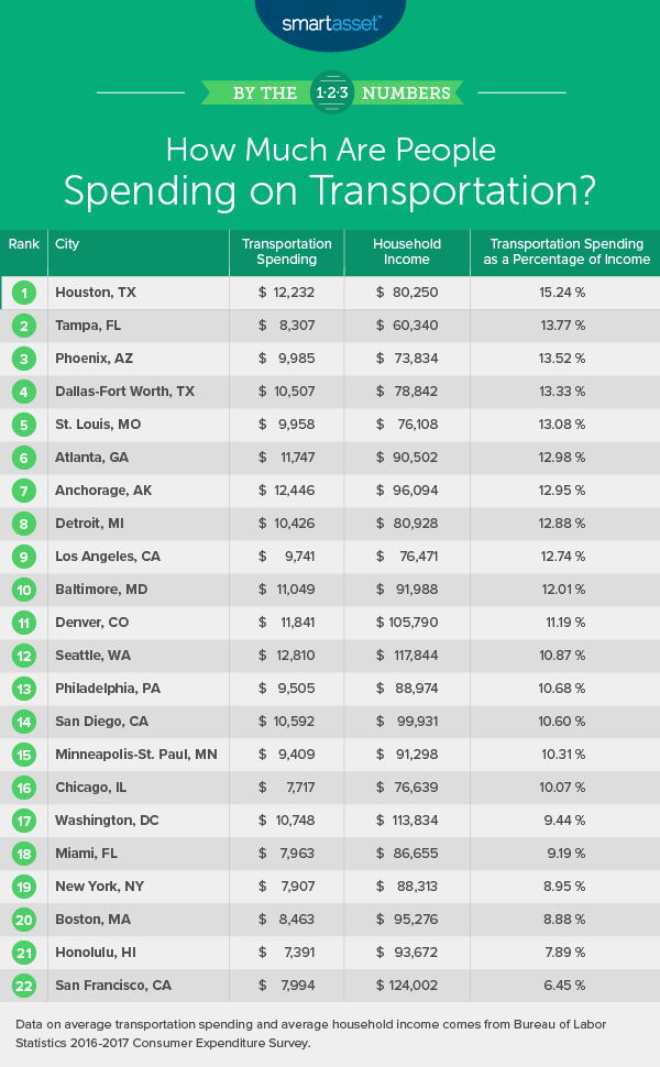 Below we rank the places in the U.S. where people spend the most on transportation. We considered 22 metro areas and looked at the following factors: average amount spent on transportation and average transportation spending as a percentage of total income. It’s important to note that if you’re making significantly more or less than the average income, this number could impact you differently compared to other people in the same area.