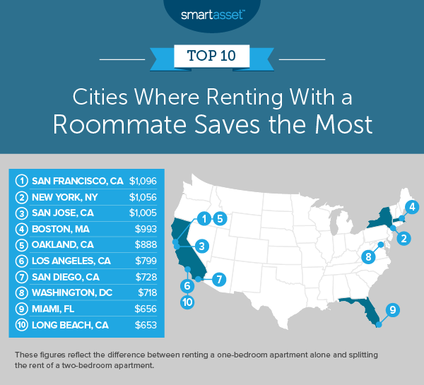 - Southern California popularity. While savings from having a roommate may be expected in pricey Northern California, which has three representatives in our top 10, Southern California matches this total. Los Angeles, San Diego and Long Beach all have average savings of more than $650 per month associated with sharing an apartment rather than living alone.