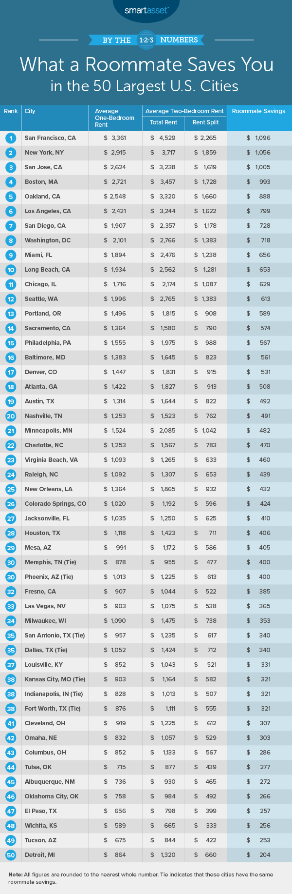 - A wide range. There is a wide range in roommate savings across the 50 big cities we considered. The amount per month saved by having a roommate in San Francisco is roughly $500 more than the average saved across all cities and almost $900 more than the amount saved in the last city on our list, Detroit, Michigan.