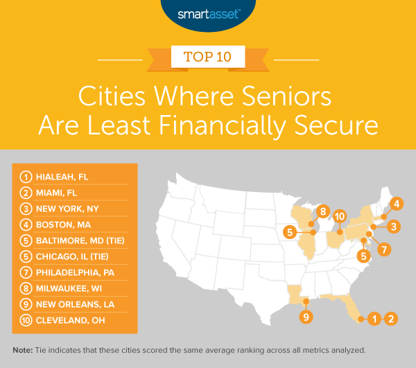 - Retirement income is a concern, even in cities where seniors are most financially secure. Even though the top 10 cities where seniors are most financially secure all rank within the top 25% of the study for their percentage of seniors with retirement income, Census Bureau data shows that there are still many local seniors who do not have additional retirement funds saved. An average of more than four in 10 seniors in those cities does not have retirement income from a pension or retirement account such as a 401(k) or IRA.