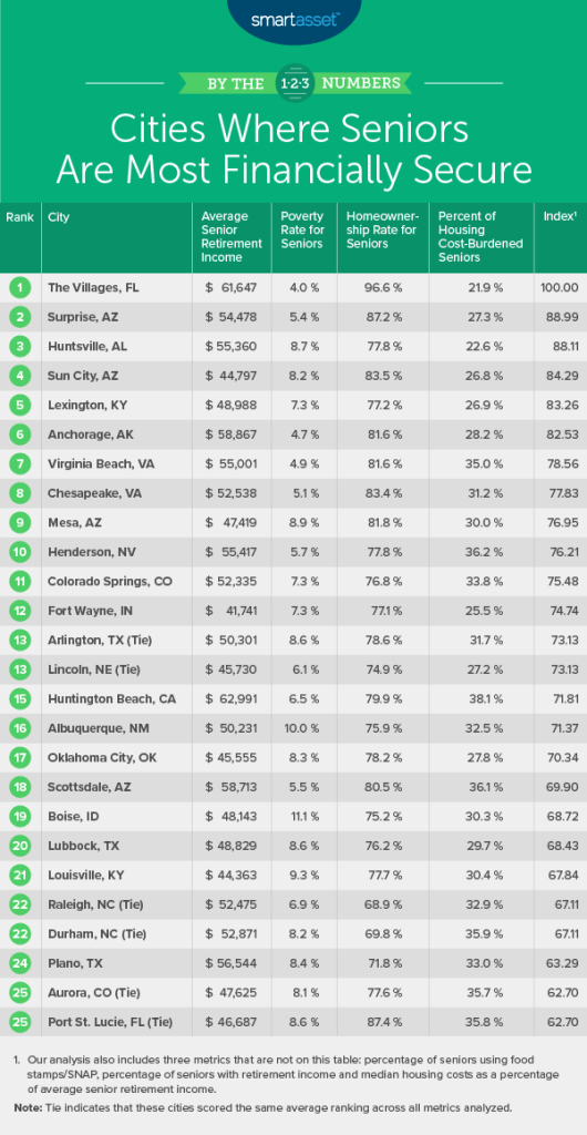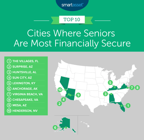 - Southern and Western cities dominate the top 10. The top 10 cities in our study where residents 65 and older are most financially secure are spread equally across only Southern and Western states. Three Arizona cities make it into the top 10 – Surprise, Sun City and Mesa – all ranking within the top 10% of the study for their high percentages of seniors who own their homes. Two Virginia cities rank in the top 10 as well – ranking within the top 5% of the study for both their relatively low percentages of seniors below the poverty line and high percentages of seniors with retirement income.
