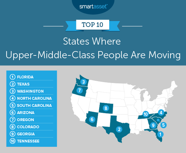 • The upper middle class is headed down South and out West – Out of the top 10 states where upper-middle-class people are moving, six are in the South. The remaining four are in the West. It’s worth noting here that the top two states on our list, Florida and Texas, don’t have a state income tax.