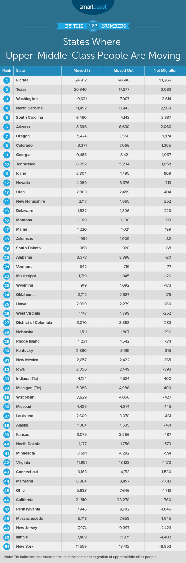 Though it ranks just one spot below Florida, Texas had less than one-third the Sunshine State’s net inflow of upper-middle-class people from 2015 to 2016. The Lone Star State had 20,340 upper-middle-class people move there in that timespan, while 17,277 upper-middle-class people left. This resulted in a net inflow of 3,060 upper-middle-class individuals.