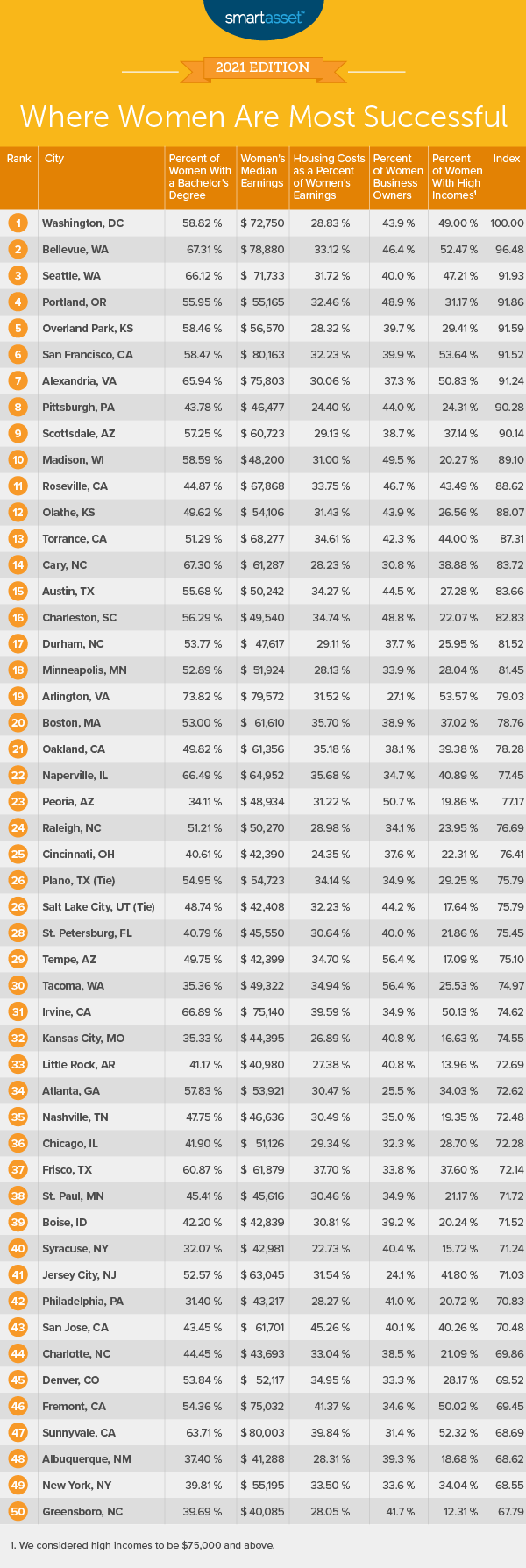 While there is still a long way to go, women have made significant strides over the last few decades to achieve greater equality in education, earnings and business ownership. According to data from the Bureau of Labor Statistics, in 2019, 57.4% of adult women participated in the workforce, which is still much less than 69.2% of men, but a big jump nevertheless over the 51.5% of participating women workers in 1980. It’s important to note that this rate has gone down since 2000, when women’s workforce participation reached 59.9%. Keeping this in mind, SmartAsset took a closer look at the U.S. cities where women are particularly successful in the workplace, and crunched the numbers to identify and rank them for the 2021 edition of this study.