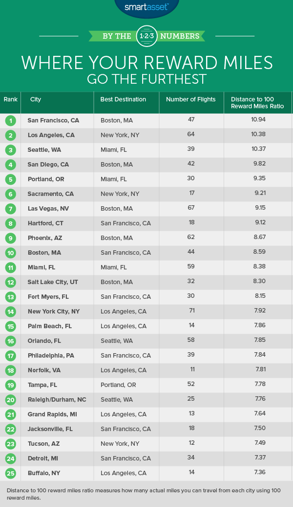 We then ranked each city by the highest distance-to-100-reward-miles ratio.