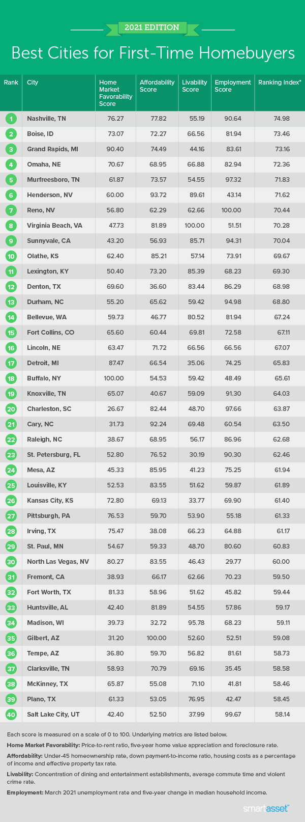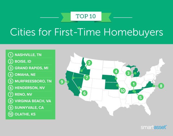 - Top cities are in Tennessee and Nevada. Nashville and Murfreesboro in Tennessee, along with Henderson and Reno in Nevada, rank in our top 10 cities for first-time homebuyers. Nashville and Murfreesboro both rank particularly well in our employment category. Meanwhile, Henderson ranks third-best for affordability and Reno takes the top spot when it comes to employment.