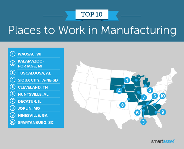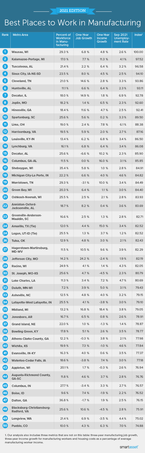 The best place to work in manufacturing for 2021 is Wausau, Wisconsin, where the industry makes up 29.34% of the workforce (the sixth-highest percentage). This metro area also finishes in the top quartile for two metrics measuring job growth: it saw 14.18% growth between 2016 and 2019 (49th) and 6.79% between 2018 and 2019 (53rd).