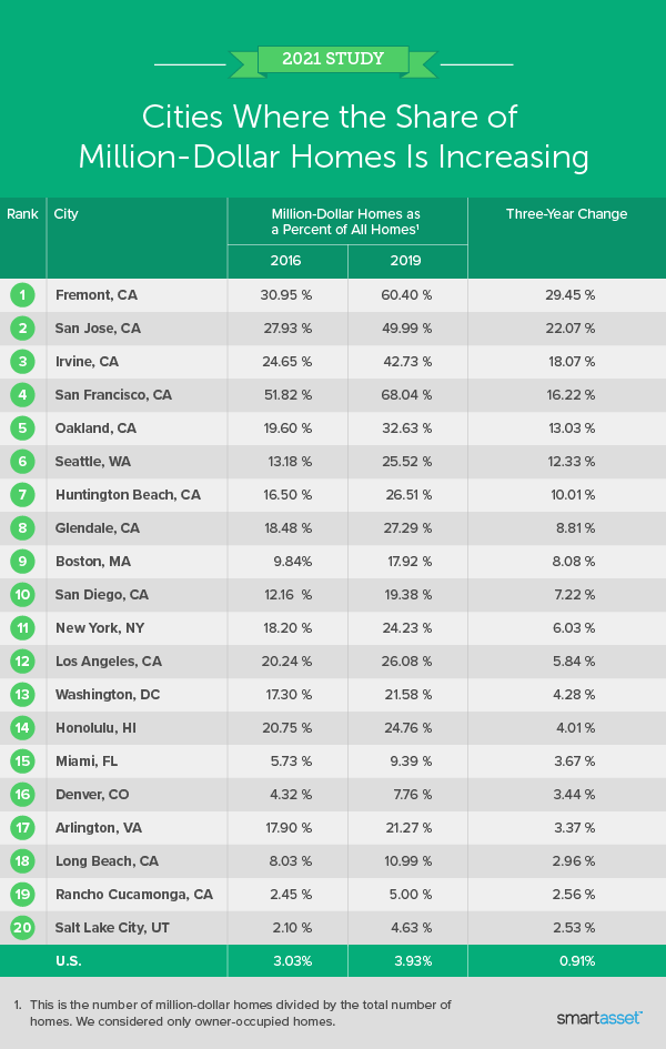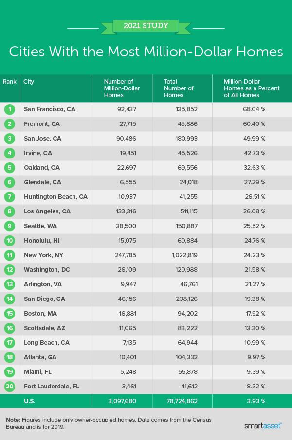 - In 13 cities, more than one in five homes are worth at least $1 million. When compared with the national share of million-dollar homes (3.93%), Census Bureau data shows that million-dollar homes are not necessarily an anomaly, comprising a much larger share (20%) in 13 cities. The first eight of these 13 cities are in California: San Francisco, Fremont, San Jose, Irvine, Oakland, Glendale, Huntington Beach and Los Angeles.