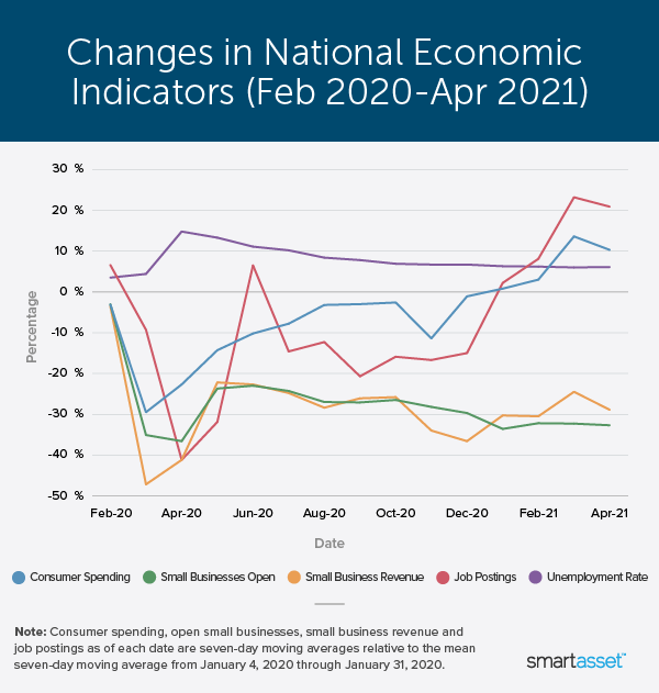 - Small business revenue. This is small business revenue as of April 30, 2021 relative to the average small business revenue between January 4, 2020 and January 31, 2020. Data comes from Womply and was published by tracktherecovery.org.