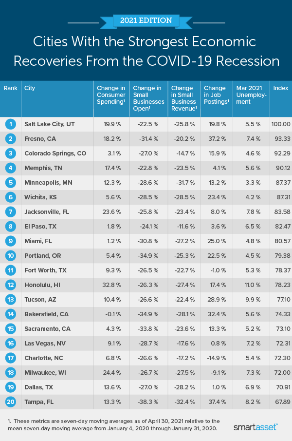 With more than 40% of the U.S. population fully vaccinated (according to New York Times data as of June 15), the economies of many cities have started rebounding at a faster pace. However, the rebound has not occurred at the same rate nationwide. Factors like vaccination rates, public spending, poverty rates, tax revenue and politics have contributed to varying rates of recovery. Keeping this in mind, SmartAsset has identified and ranked the cities with the strongest economic recoveries in 2021 from the COVID-19 pandemic.