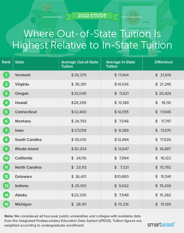 - Tuition is highest in Vermont. Not only does Vermont have the nation’s highest average out-of-state tuition ($39,379), but also the highest in-state tuition. Residents of the Green Mountain State pay an average of $17,464 per year when attending one of the state’s public colleges and universities.