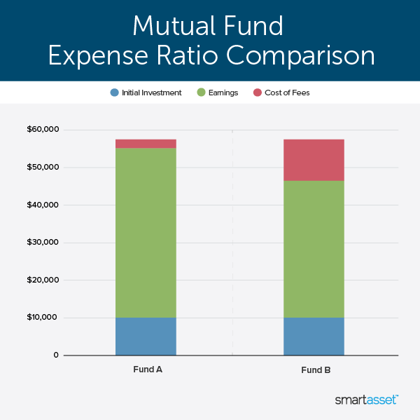 Fund B, on the other hand, will grow more slowly because 0.60% more in fees will be extracted from the account each year. While Fund B will grow to the same balance before fees ($57,435), the net balance after fees is drastically different. The same $10,000 invested in Fund B will grow to just $46,416 (after fees) with $11,019 going to fees. This means that net earnings are $36,416.