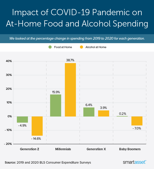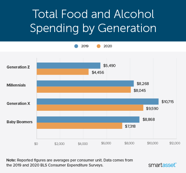 - Food and alcohol spending declined for all generations in 2020. The largest decrease came from Generation Z (-18.8%), followed by baby boomers (-17.5%), Generation X (-10.5%) and millennials (-2.7%).