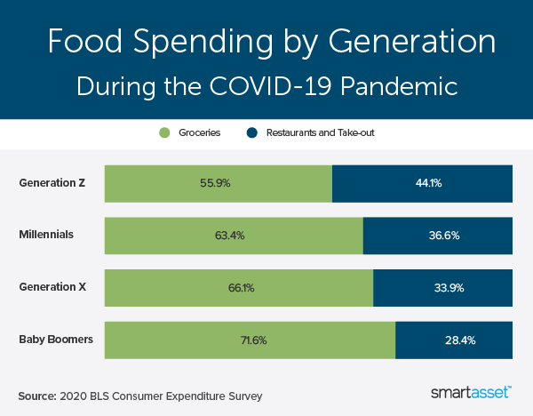 - Younger individuals are more likely to spend on food away from home, despite the pandemic. The youngest generation in this study (Generation Z) spent an average of 44.1% of their total food budget on restaurants and takeout, almost twice as much as baby boomers (28.4%).