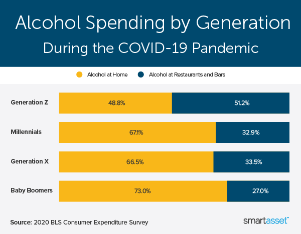 - Generation Z spends most on alcohol at restaurants and bars while baby boomers spend the most on alcohol at home. An average of roughly 52% of alcohol spending for Generation Z went towards drinks at restaurants and bars. In comparison, baby boomers spent the least, with almost three-quarters (73%) of their total alcohol spending going towards drinks consumed at home.