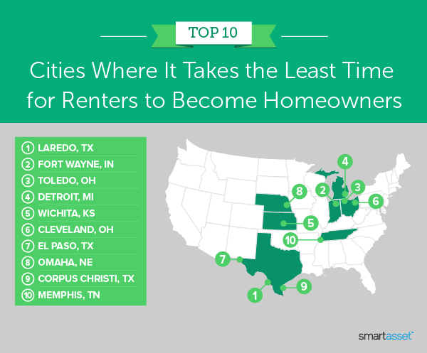 - Midwest cities dominate the top 10. Six of the 10 cities where it takes the least time for renters to become homeowners are in the Midwest. They include Fort Wayne, Indiana; Toledo, Ohio; Detroit, Michigan; Wichita, Kansas; Cleveland, Ohio and Omaha, Nebraska. The estimated average length of time for renters to become homeowners in all six of those cities is less than two and a half years.