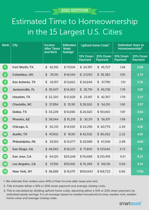 Across the 15 largest cities, Fort Worth, Texas has the lowest estimated time to homeownership. The average household in Fort Worth could afford the upfront costs of buying a home in 2.69 years if they put 20% down on a house, or 1.46 years if they put 10% down on a house.