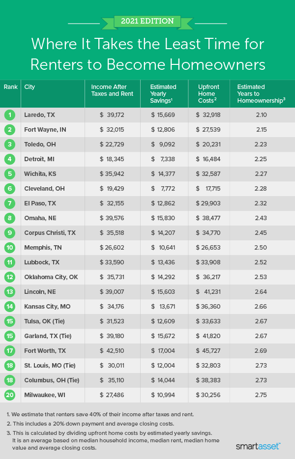 With the lowest average time to homeownership, Laredo, Texas ranks as the No. 1 city in our study. Census data shows that the median household income in Laredo is about $57,500. After taxes and rent, the average household has about $39,200 leftover in disposable income. Assuming 40% of this figure is saved annually, renters may be able to afford a home in close to two years.