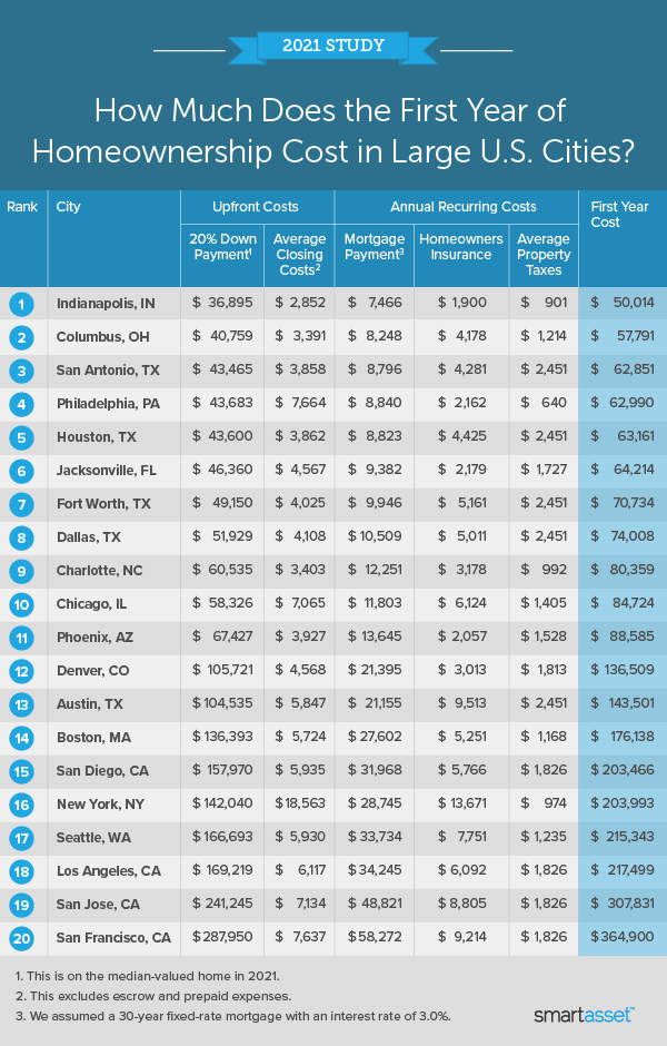 - First-year homeownership costs differ across the study by a factor seven. In Indianapolis, Indiana, you can expect to spend over $50,000 in your first year of homeownership, 7.3 times less than in San Francisco, California, where costs total $364,900.