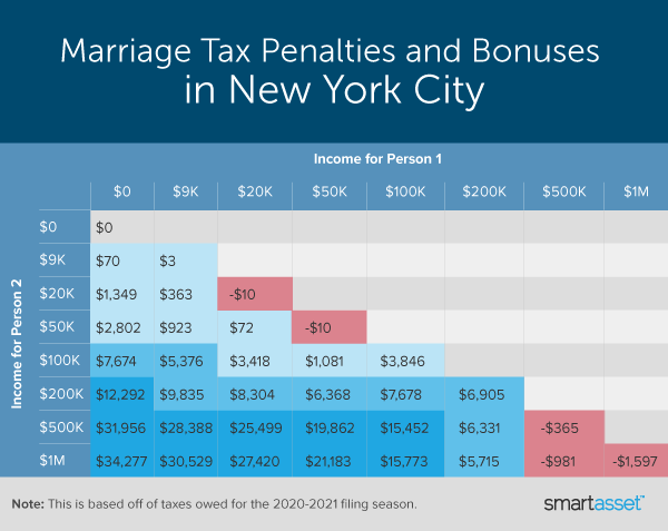 To see this in action, let’s consider a couple living in New York City where both the city and state also have a progressive tax system. The table below shows the marriage tax penalties and bonuses for couples with incomes that span the seven federal tax brackets.