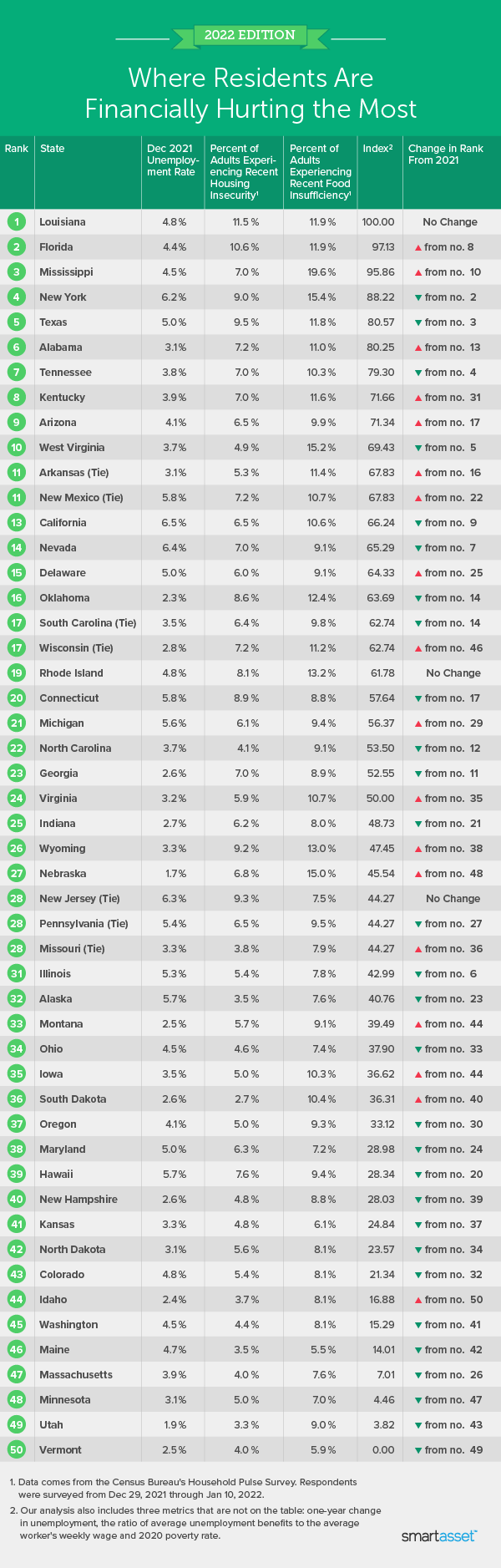 We ranked each state in every metric, giving a half weight to the following metrics: December 2021 unemployment rate and one-year change in unemployment rate. We gave a full weight to all other metrics. Using those rankings, we found each state’s average ranking and used the average to determine a final score. The state with the highest average ranking received a score of 100, ranking as the state where residents struggle the most financially. The state with the lowest average ranking received a score of 0, ranking as the state where residents struggle the least financially.